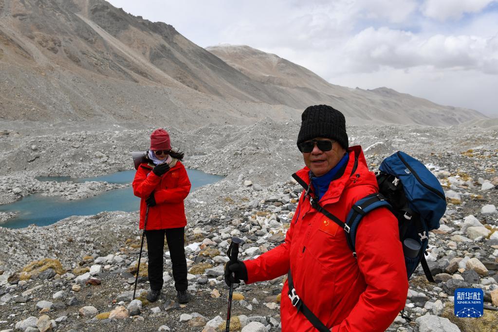 朱彤(右)和科研人員在珠峰登山大本營和絨布冰川間徒步穿梭(5月1日攝)。新華社記者 姜帆 攝