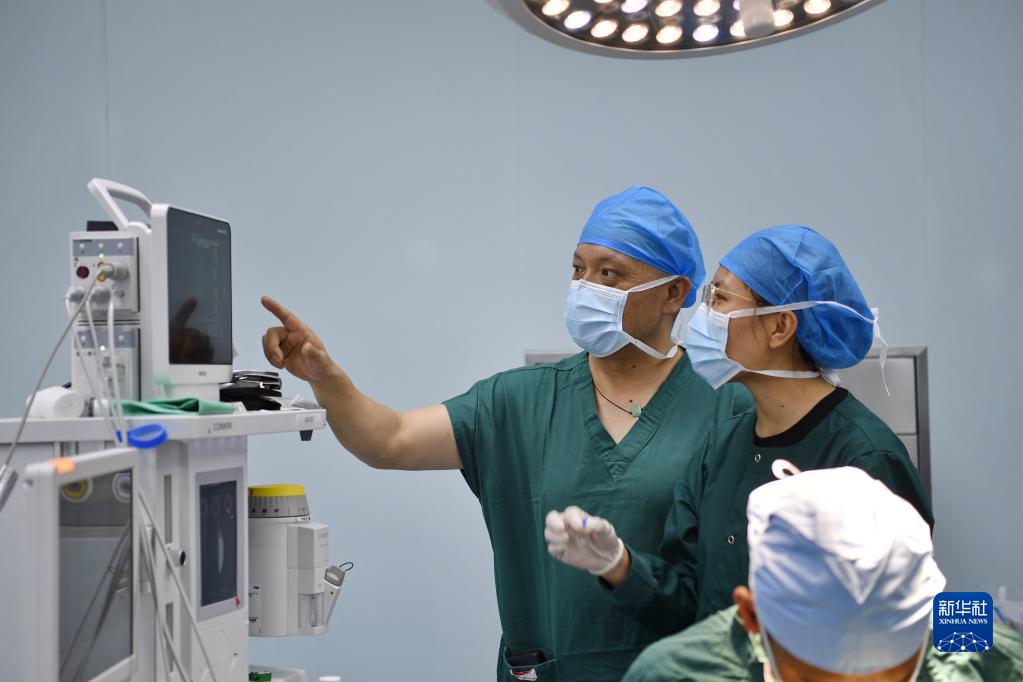 7月31日,在阿里地區(qū)人民醫(yī)院手術(shù)室,西藏自治區(qū)人民醫(yī)院麻醉科醫(yī)生達(dá)娃吾珠(左一)指導(dǎo)當(dāng)?shù)芈樽磲t(yī)生旦增次白進(jìn)行麻醉監(jiān)測(cè)。新華社記者 張汝鋒 攝