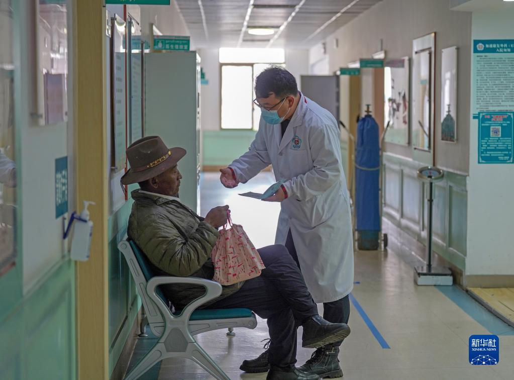 6月12日,王彤旭醫(yī)生在米林市人民醫(yī)院走廊里詢(xún)問(wèn)患者病情恢復(fù)情況。新華社記者 邵澤東 攝