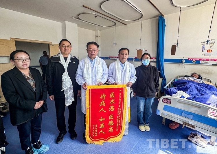 圖為患者家屬向醫(yī)療隊獻(xiàn)上哈達(dá)和錦旗