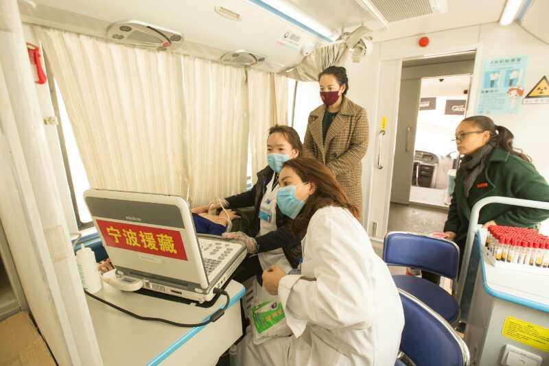 一輛八米多長(zhǎng)的農(nóng)牧民健康體檢車按照年度計(jì)劃,穿梭于比如縣的大小鄉(xiāng)村。車上載有先進(jìn)的DR(數(shù)字影像攝片機(jī))、便攜彩超機(jī)、心電圖機(jī)、便攜檢驗(yàn)設(shè)備。這臺(tái)車是浙江省援藏副指揮長(zhǎng)、比如縣委常務(wù)副書記盛悠聯(lián)系寧波市江北區(qū)政府捐贈(zèng)的。在第八批寧波紹興援藏工作組干部的精心設(shè)計(jì)下,專門向宇通公司定制的一輛功能齊全的大巴體檢車,光車底和改裝費(fèi)用就達(dá)73萬(wàn)元。它與普通體檢車需要接入停泊地市電、自來(lái)水才能運(yùn)行不同,寧波的援藏干部根據(jù)西藏鄉(xiāng)村缺電少水的現(xiàn)狀,多方咨詢方案,最后增加了價(jià)值十萬(wàn)元的高壓電容設(shè)備,實(shí)現(xiàn)了通過車載的小型發(fā)電機(jī)帶動(dòng)50千瓦的DR,并可連續(xù)運(yùn)轉(zhuǎn),這在全國(guó)尚屬首例。車上還配備主動(dòng)式抽水泵,解決上水問題,并配有空調(diào)系統(tǒng)。車子開到哪里,便可不靠外力,進(jìn)行包括拍攝X光片、彩超、心電、檢驗(yàn)等的全面健康體檢,許多鄉(xiāng)鎮(zhèn)衛(wèi)生院也不如這輛體檢車的配置強(qiáng)大。