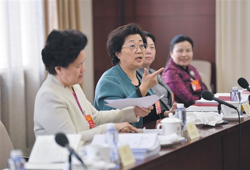 3月10日,全國政協(xié)婦聯(lián)界別在駐地舉行小組會議,討論政協(xié)工作。全國政協(xié)委員崔郁(左二)認為,應保證女性在基本醫(yī)療衛(wèi)生服務方面有更多獲得感。經(jīng)濟日報-中國經(jīng)濟網(wǎng)記者 高興貴攝