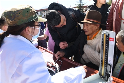 圖為近日,武警西藏總隊(duì)機(jī)動(dòng)第二支隊(duì)的醫(yī)務(wù)人員免費(fèi)為群眾進(jìn)行診療。丹增群培 攝
