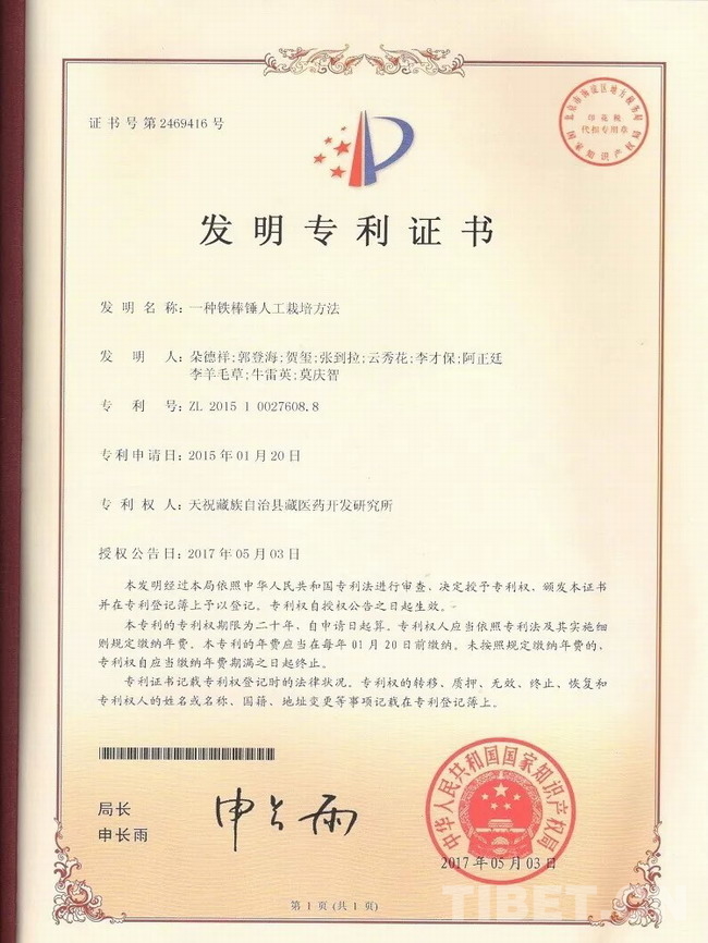 圖為天??h藏醫(yī)藥開發(fā)研究所發(fā)明的“一種鐵棒錘人工栽培方法”獲得了國家知識(shí)產(chǎn)權(quán)局發(fā)明專利。
