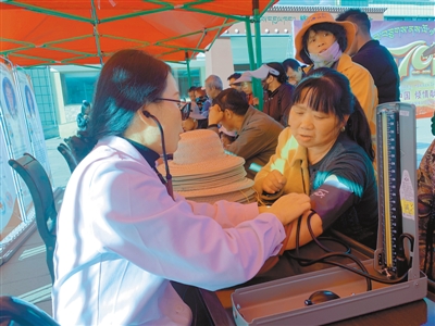 近日,由西藏林芝市人民醫(yī)院的醫(yī)護(hù)人員組成的志愿者服務(wù)隊(duì),走進(jìn)林芝市巴宜區(qū)為群眾送醫(yī)送藥送健康,把關(guān)懷送到群眾心中。圖為林芝市人民醫(yī)院醫(yī)護(hù)人員在巴宜區(qū)廈門廣場(chǎng)為群眾測(cè)量血壓。記者 張猛 史金茹 攝