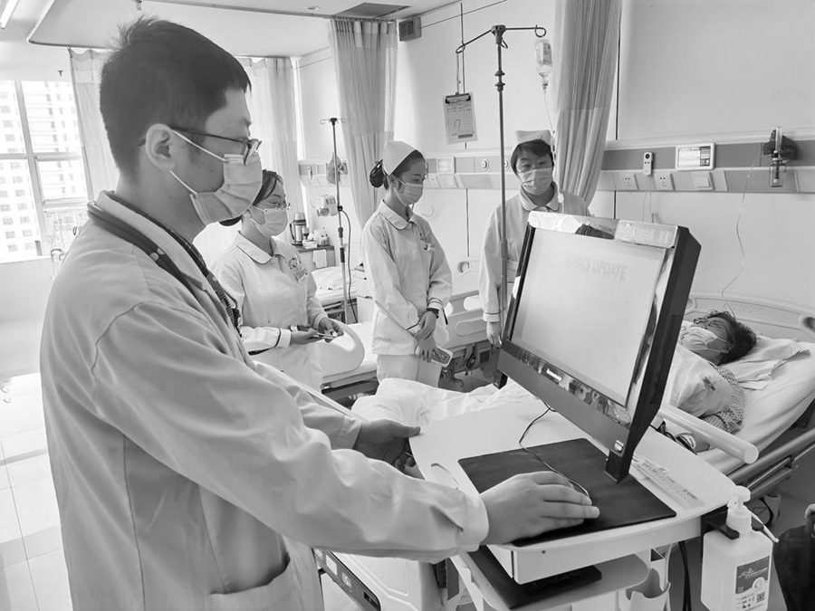 西寧市第一醫(yī)療集團總院醫(yī)生運用移動工作站為患者服務(wù)。