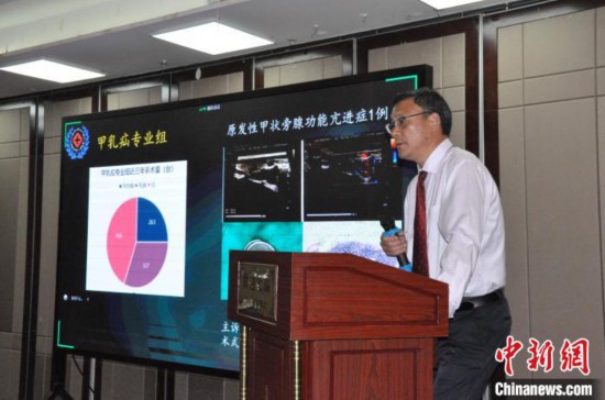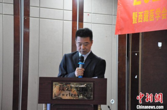 圖為巴桑頓珠介紹西藏自治區(qū)人民醫(yī)院普通外科和西藏醫(yī)學(xué)會(huì)普通外科分會(huì)的概況。 旦增貢色 攝