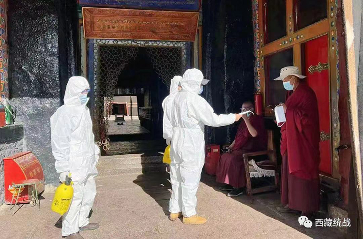 圖為西藏自治區(qū)日喀則市薩迦寺管委會(huì)在寺廟內(nèi)開展疫情防控工作 圖片來(lái)源:西藏統(tǒng)戰(zhàn)微信公眾號(hào)