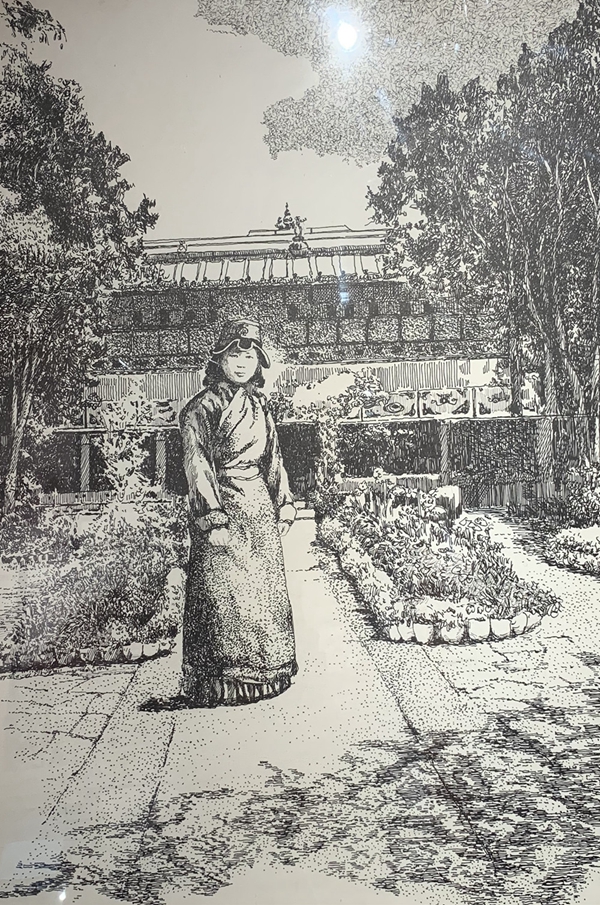圖為《劉曼卿在拉薩羅布林卡格桑頗章》。翻拍自丁小文鋼筆畫。