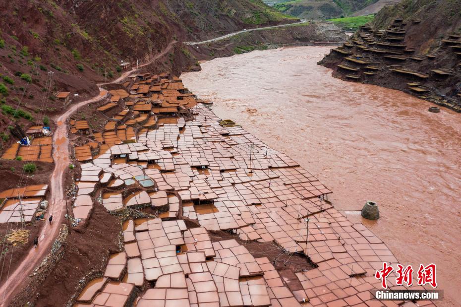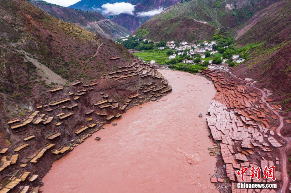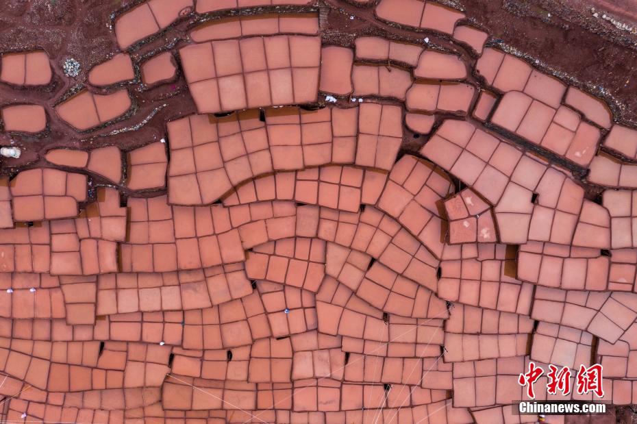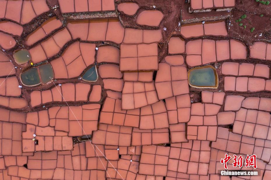 當?shù)孛癖娫跒憸娼祥_山鑿井,取出巖層深處含鹽的鹵水倒入鹽田,經(jīng)陽光蒸曬、風干,結(jié)晶成鹽。何蓬磊 攝