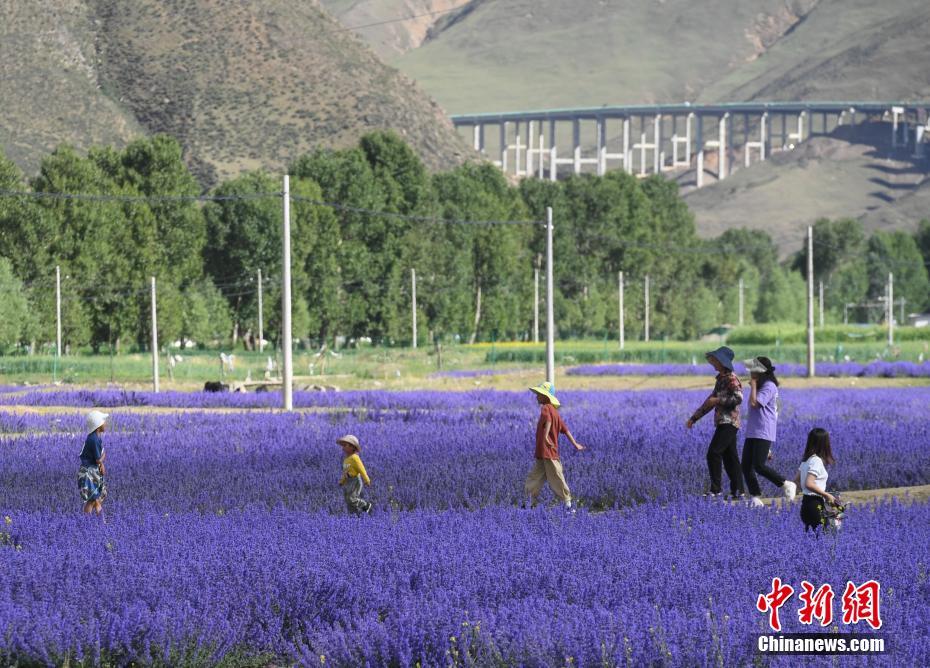 西藏百畝薰衣草花海綻放引游人