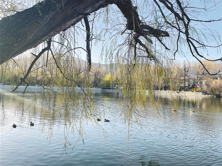 春風不僅化開了宗角祿康的湖水,也化開了這座高原古城一整個寒冬的倦懶。柳樹吐露出稚嫩的樹芽,成群的赤麻鴨、斑頭雁浮游在湖中,享受著“紅掌撥清波”的悠閑……