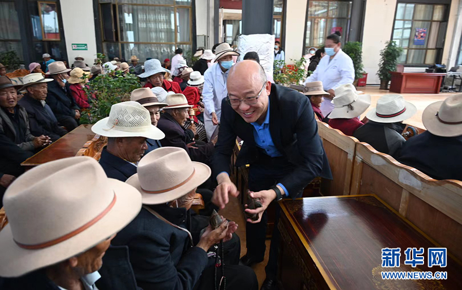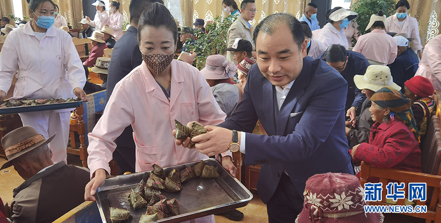 6月3日,在西藏山南市集中供養(yǎng)服務(wù)中心,安徽第七批援藏工作隊(duì)隊(duì)長汪華東為孤寡老人送上粽子。新華網(wǎng) 王雷 攝