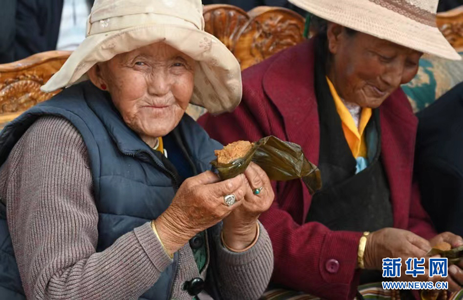 6月3日,在西藏山南市集中供養(yǎng)服務(wù)中心,老人們品嘗美味的粽子。新華網(wǎng)發(fā)(許國 攝)