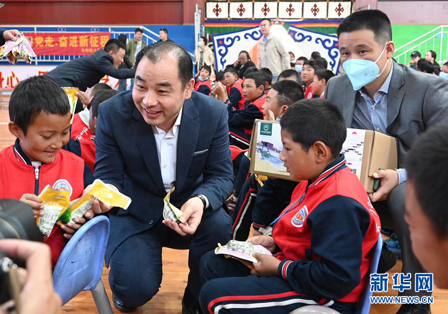 6月3日,在西藏山南市特教學(xué)校,安徽岸香集團(tuán)董事長黃保鎖為孩子們分發(fā)粽子。新華網(wǎng)發(fā)(許國 攝)