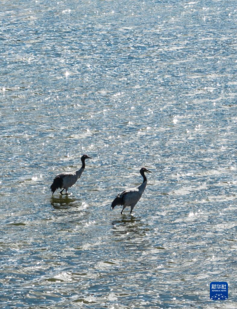 9月16日在多慶湖邊拍攝的黑頸鶴(無(wú)人機(jī)照片)。新華社記者 晉美多吉 攝
