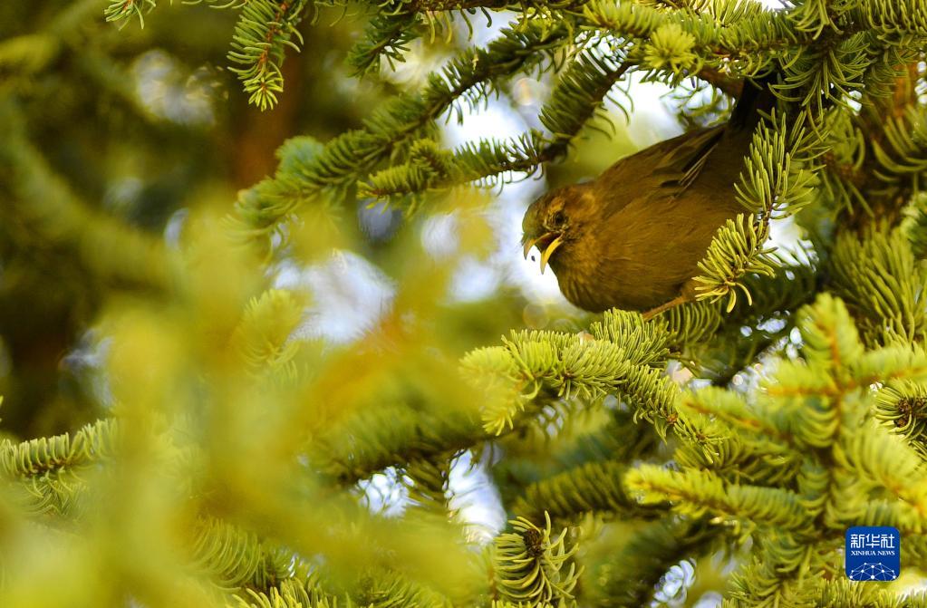 山噪鹛在樹(shù)上覓食(9月21日攝)。新華社記者 張汝鋒 攝