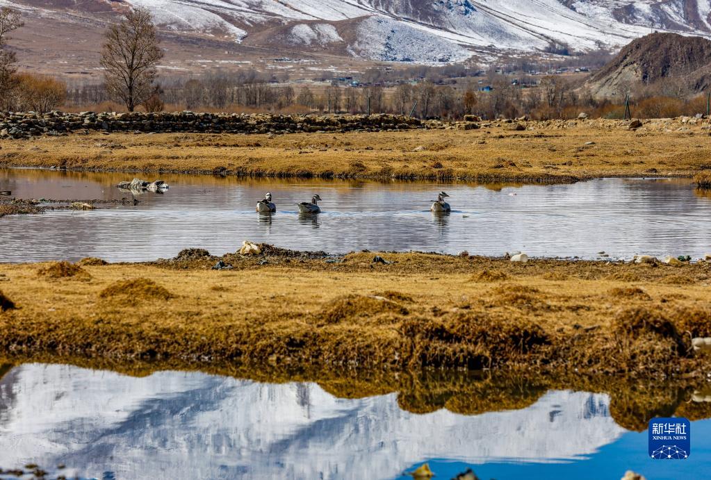 在拉薩市林周縣的濕地里休憩的斑頭雁(3月1日攝)。新華社記者 姜帆 攝