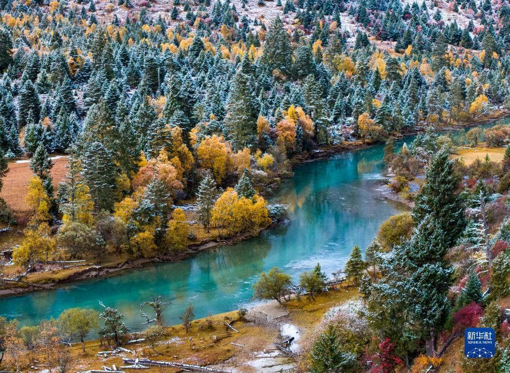時(shí)值金秋,西藏林芝市秋色已濃,黃葉與初雪交織,流水并雪山輝映,景色如詩如畫。