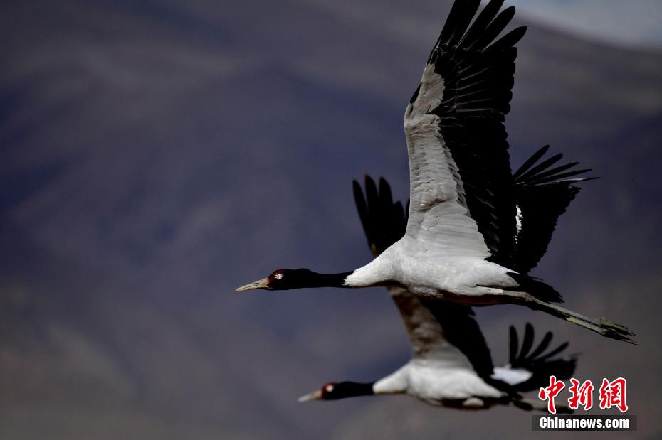 圖為11月21日,西藏日喀則市桑珠孜區(qū)邊雄鄉(xiāng)黑頸鶴振翅高飛。李林 攝