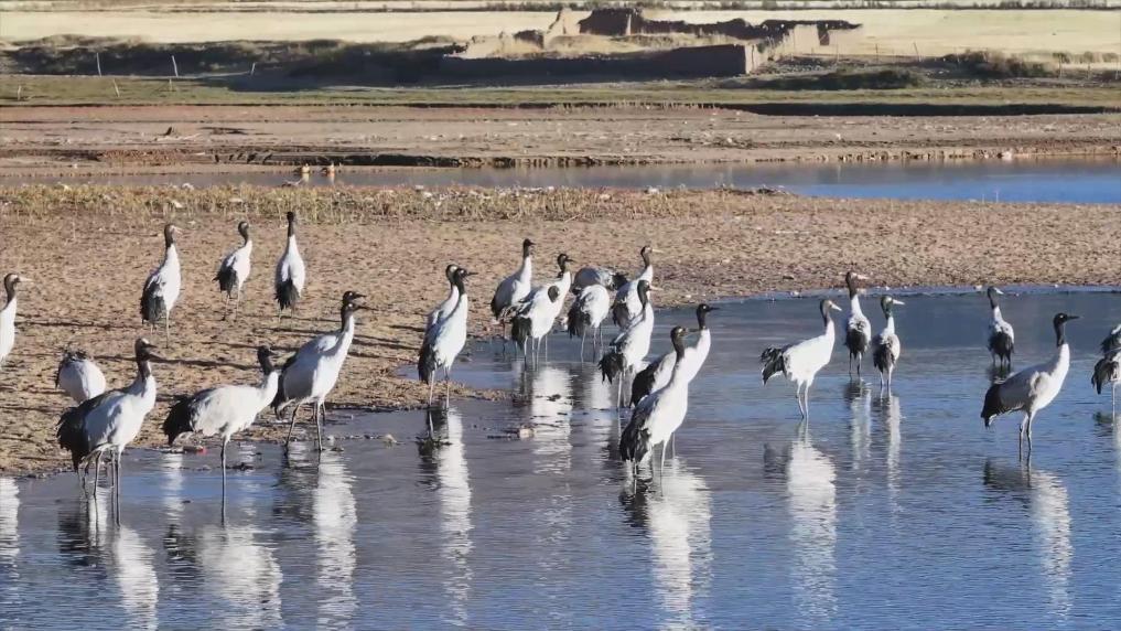 西藏日喀則:越冬黑頸鶴成冬日田間美景