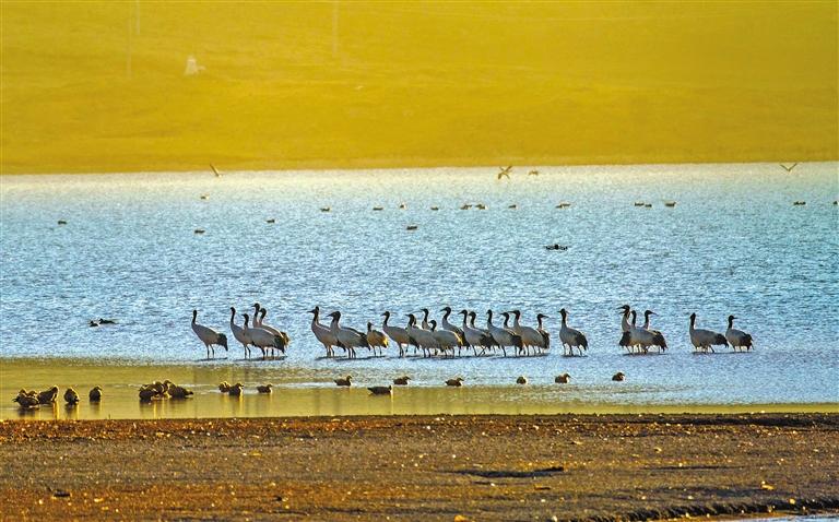 圖為黑頸鶴在雅魯藏布江畔覓食、嬉戲。德吉 攝