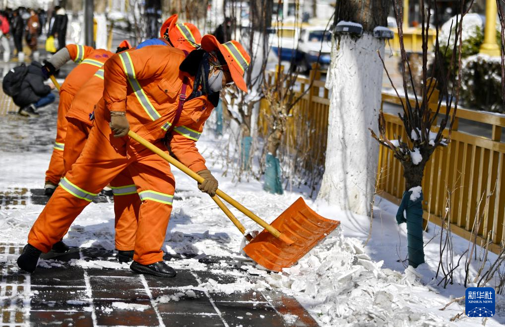 1月18日,環(huán)衛(wèi)工人在清理拉薩街道上的積雪。新華社記者 張汝鋒 攝