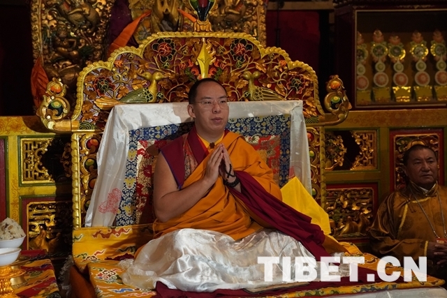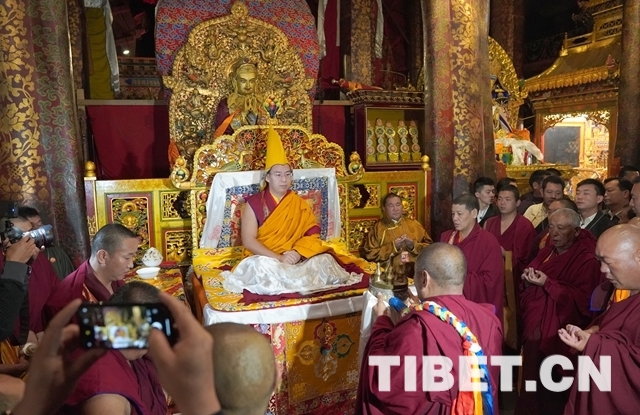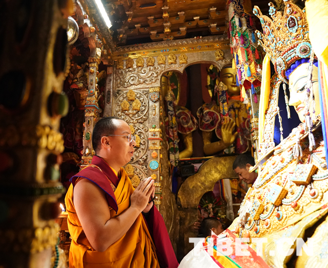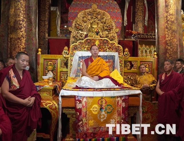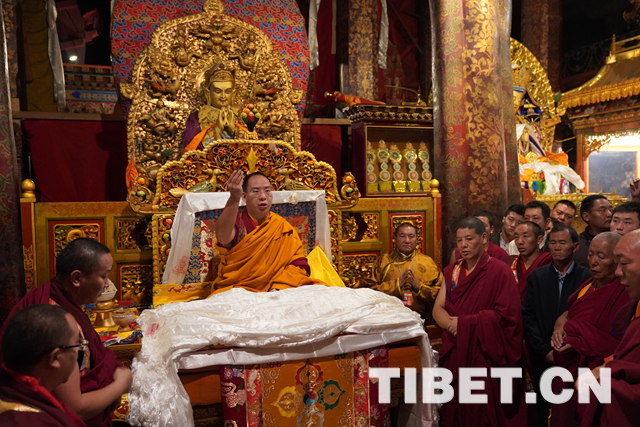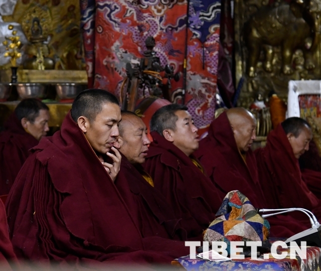 朝拜結(jié)束后,十一世班禪登上設(shè)在釋迦牟尼佛像正對面的寶座上,面朝佛像,帶領(lǐng)眾僧念誦經(jīng)文,祈愿五谷豐登、國泰民安、世界和平。