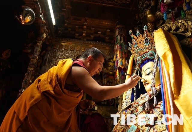 圖為十一世班禪為釋迦牟尼十二歲等身佛像面部涂繪金粉。攝影:王淑