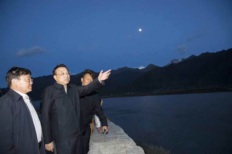 7月25日傍晚,李克強(qiáng)總理來到雅魯藏布江與尼洋河交匯處,考察水資源和生態(tài)保護(hù)情況。來源:中國政府網(wǎng)