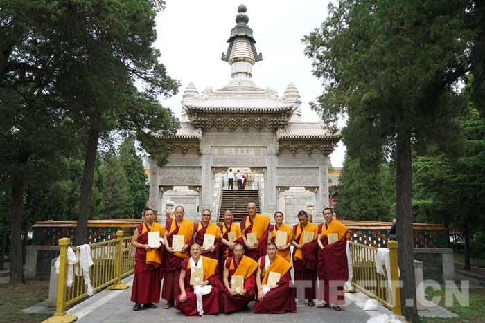 圖為中國藏語系高級佛學院第十四屆格魯派“拓然巴”學銜獲得者在西黃寺清凈化城塔前合影留念。后排右三為本文作者日巴。