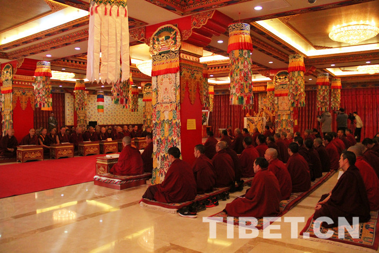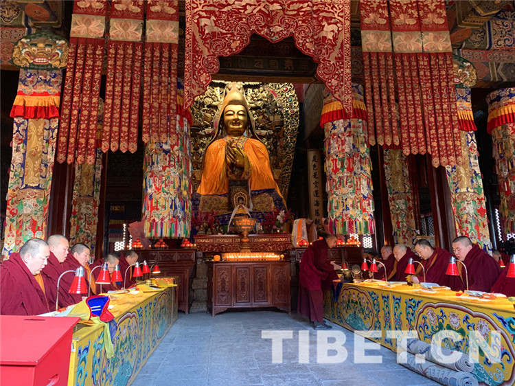 十一世班禪口念經(jīng)文,百余位僧人身著戒衣,按順序分坐于大殿兩側(cè),跟隨大師虔誠詠誦《皈依發(fā)心》《文殊師利名贊》《十世班禪大師功德新祈禱詞》《回向祈禱詞》《十一世班禪大師常住世間法》《白度母贊》《釋教昌盛祈愿》,以及《興隆正法》《消除眾劫》《六時(shí)吉祥》等。
