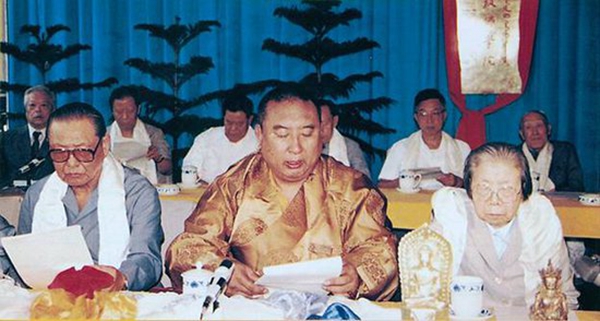 圖為習(xí)仲勛(左一)、十世班禪(中)、鄧穎超(右一)參加中國藏語系高級佛學(xué)院成立大會。圖片來源:人民日報