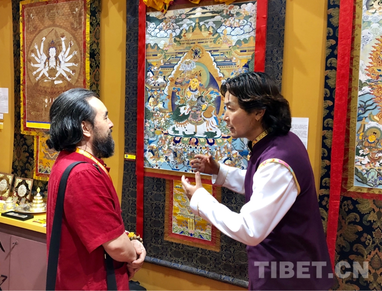 圖為熱貢藝術(shù)傳承人格桑嘉措為外國(guó)游客講解熱貢文化 攝影:尼知加