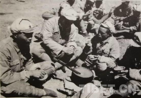 圖為官兵們依靠代食粉充饑。圖片來(lái)源:紀(jì)錄片《口述西藏》