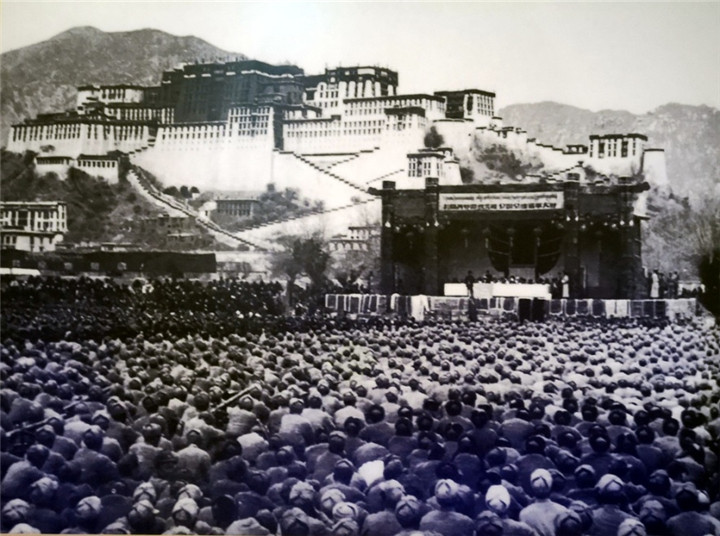 圖為1954年12月25日,在拉薩舉行的慶??挡毓罚ń翊ú毓罚?、青藏公路通車(chē)典禮大會(huì)。翻拍:李元梅