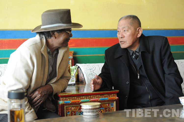 圖為當(dāng)年率領(lǐng)申扎縣牧民群眾開發(fā)藏北無人區(qū)的傳奇英雄、原西藏人大常委會(huì)副主任洛桑丹珍(右),專程來到嘎措鄉(xiāng)白瑪家中,看望當(dāng)年一同開發(fā)藏北無人區(qū)的鄉(xiāng)黨委書記白瑪(左)(2013年7月27日)攝影:唐召明