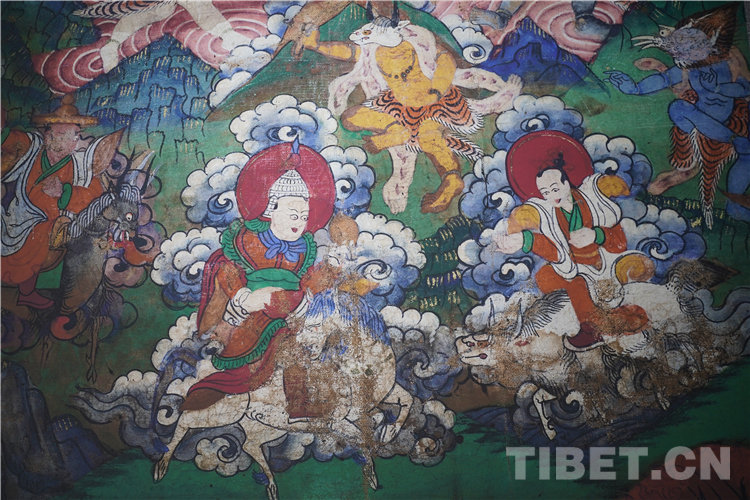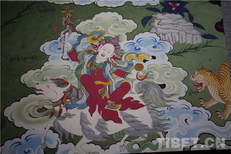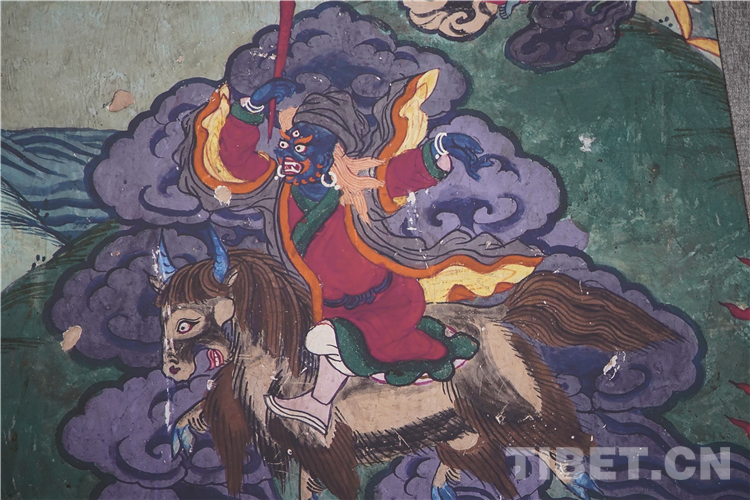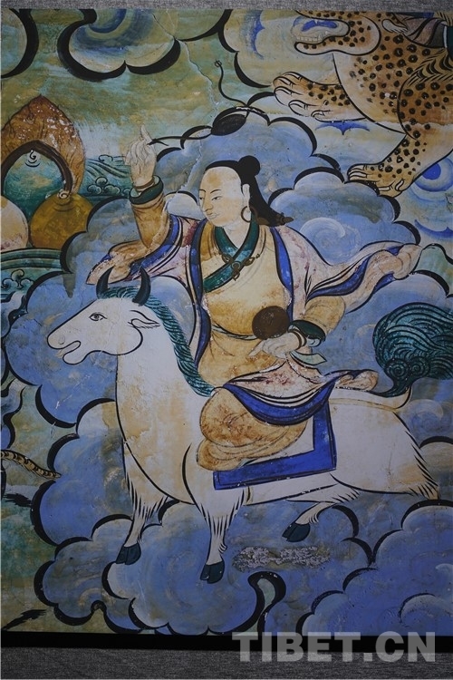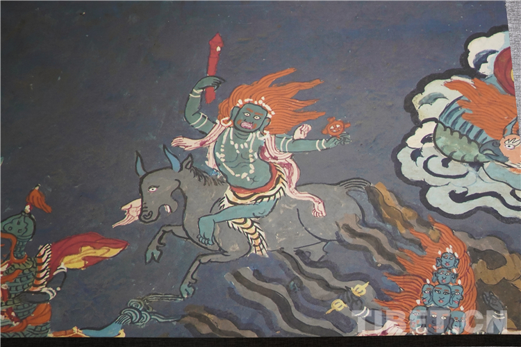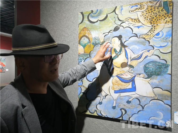 展廳中還有一副遠(yuǎn)看非常另類,細(xì)細(xì)欣賞漢藏繪畫風(fēng)格交流交融的作品,那是一幅四川省阿壩藏族羌族自治州金川縣墨爾多神山壁畫的局部作品。東智先生說:“這幅局部畫作從發(fā)髻、服飾等多個(gè)方面充滿了漢族風(fēng)格,甚至人物穿的還是漢服,座下是像馬一樣的牦牛,但是手上掄著古朵(古朵指的是用牦牛毛或者山羊毛編織成的拋石繩,可以將石頭投擲到較遠(yuǎn)的地方,是牧民們用來放牧的工具),非常有辨識(shí)度,充滿藏族文化特色?!?/p>