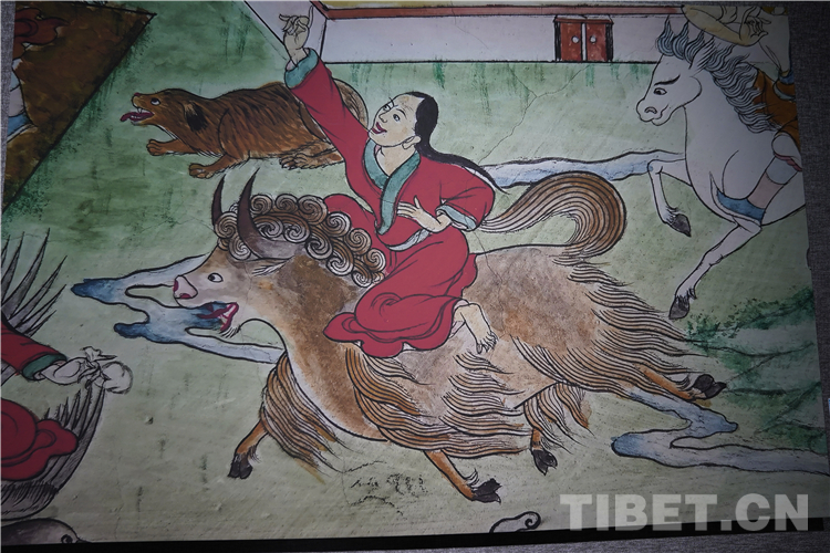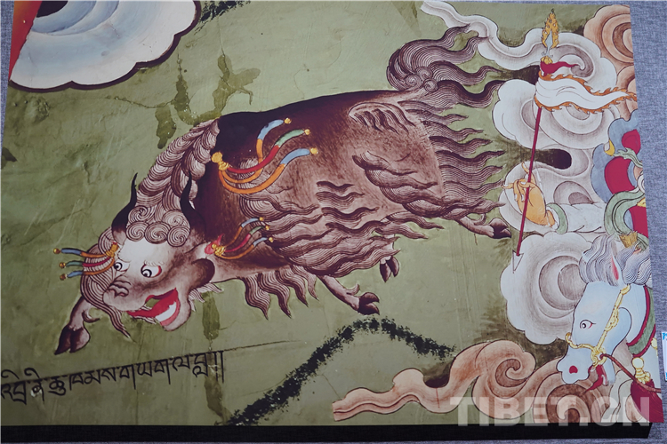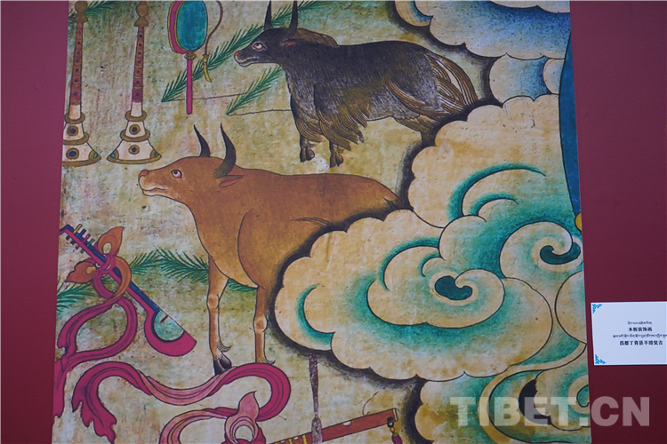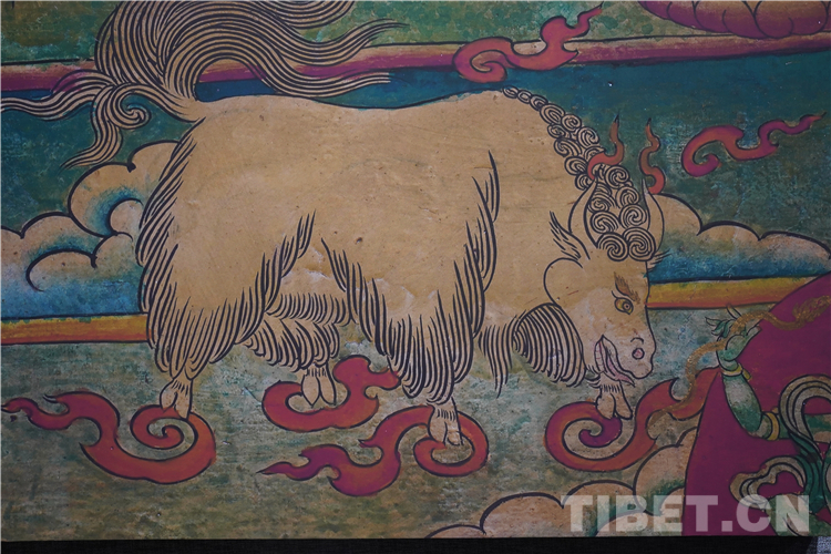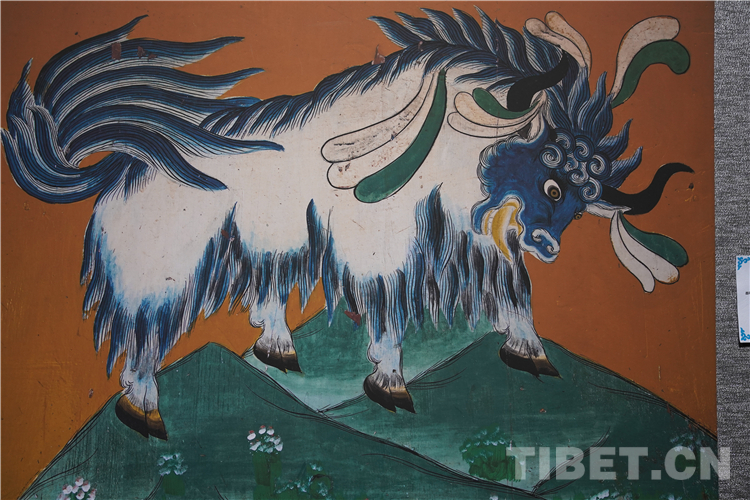 牦牛走進(jìn)了藏族人民的生活,在幾千年的相處中,牦牛升華成任何一種事物和元素,完美融入了壁畫、唐卡、建筑等多種藝術(shù)創(chuàng)作中。
