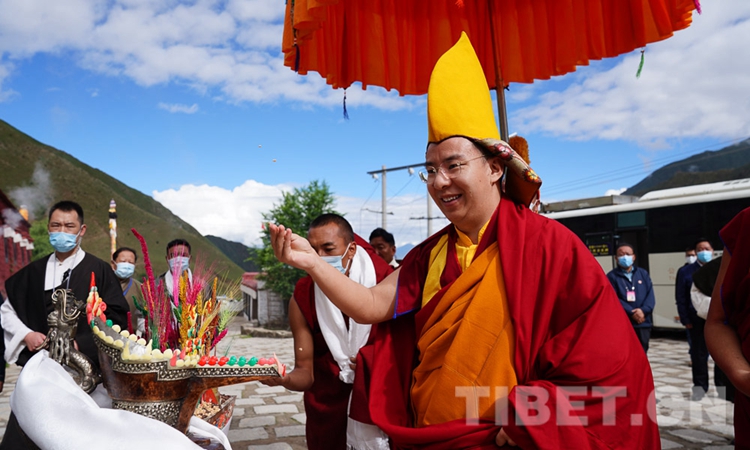 圖為十一世班禪在桑普寺拋灑青稞、祈愿豐收 攝影:王淑