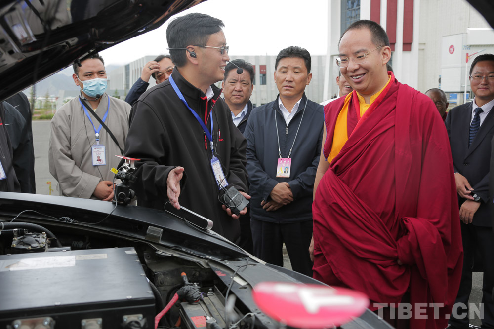 在園區(qū)停車場,十一世班禪現場觀摩了無人駕駛汽車演示,在看到汽車順利完成一系列無人駕駛動作后,十一世班禪鼓起了掌。隨后,十一世班禪參觀了數據機房。