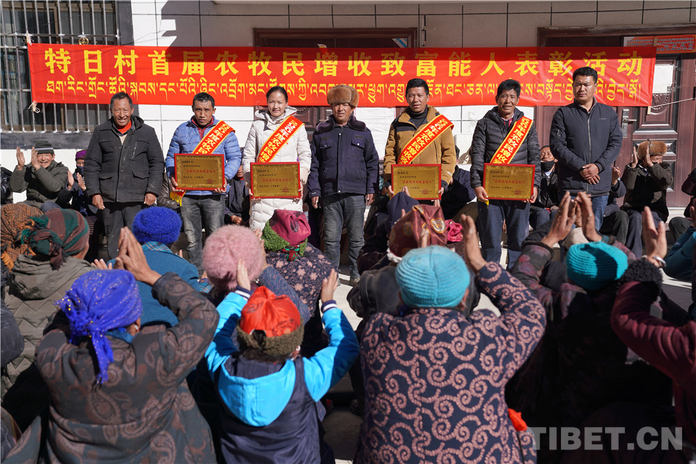 在表彰大會(huì)上,特日村第一支部書(shū)記米瑪扎西說(shuō):“這次特地從黨建經(jīng)費(fèi)中拿出2000元,給4位致富能人表彰,就是為了鼓勵(lì)有更多的能人帶領(lǐng)大家共同脫貧奔小康?!毕乱徊剑濉皟晌毕M赃@次致富表彰大會(huì)為動(dòng)力,最大限度發(fā)揮致富帶頭人示范引領(lǐng)和輻射帶動(dòng)作用,以傳、幫、帶、教等方式帶領(lǐng)村民們向著共同富裕的目標(biāo)不斷前進(jìn)。