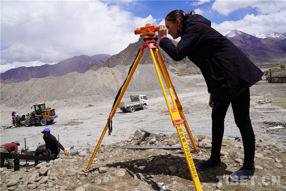 圖為洛桑白珍在工地上測(cè)量放線中