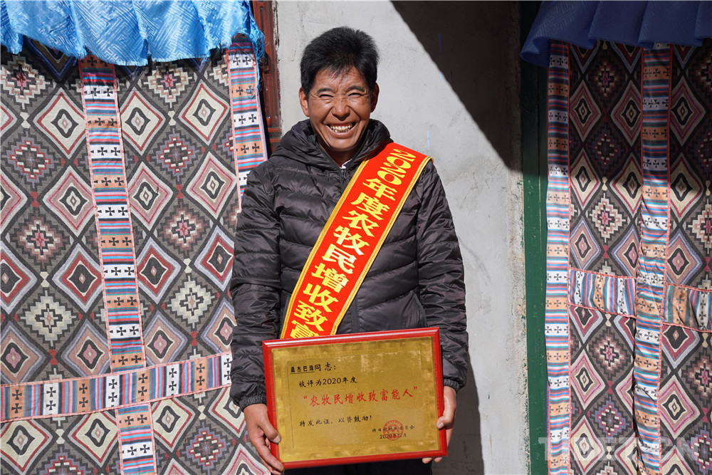 勞動(dòng)致富的桑杰巴珠。他曾經(jīng)是享受?chē)?guó)家補(bǔ)助的一般貧困戶(hù)。為了早日摘掉貧困帽子,自2019年開(kāi)始,他先后貸款5萬(wàn)元購(gòu)買(mǎi)拖拉機(jī),在工地上搞運(yùn)輸;參加了涂裝工、抹灰工培訓(xùn)班,以技術(shù)求創(chuàng)收;在拉薩、澤當(dāng)承包工地人工。艱辛的努力收獲了香甜的碩果,如今的桑杰巴珠日工資最低300元;2020年帶動(dòng)本村12人就業(yè),共創(chuàng)收達(dá)48萬(wàn)多元。他的大女兒米瑪卓瑪于2018年考上了湖北理工學(xué)院漢語(yǔ)文專(zhuān)業(yè),小女兒拉巴曲珍考上了山南完中,曾經(jīng)的困難戶(hù)華麗轉(zhuǎn)身成為小康人家。