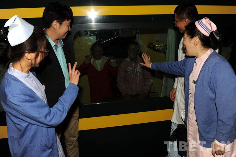 這是北京兒童醫(yī)院醫(yī)生在北京西站為術后乘火車返藏的先心病患兒送行告別(唐召明2012年9月28日攝)
