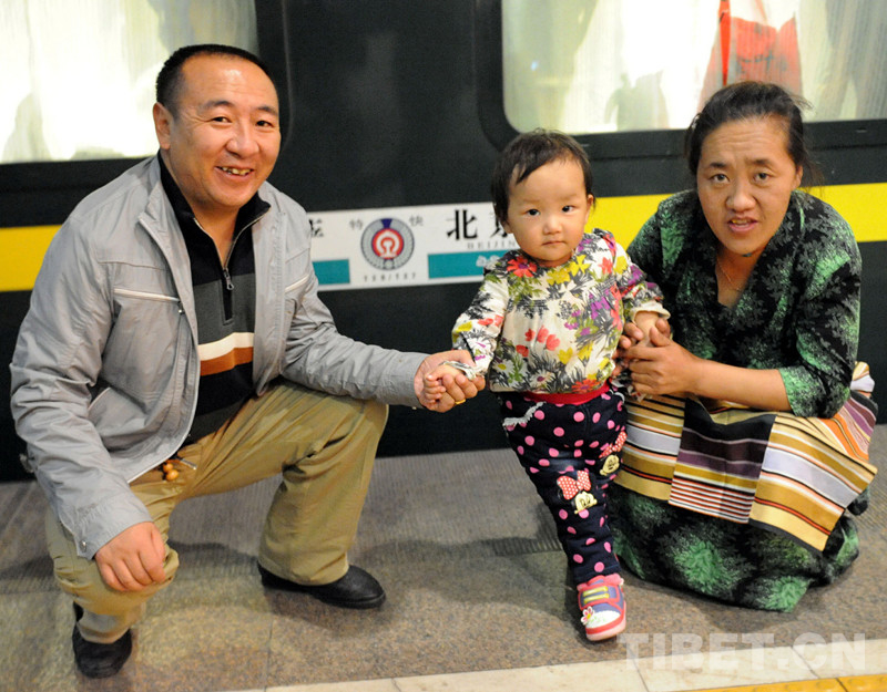 這是其美拉姆從北京乘火車返藏時,與阿爸和阿媽在北京西站所乘坐的京藏列車前合影留念(唐召明2014年10月17日攝)