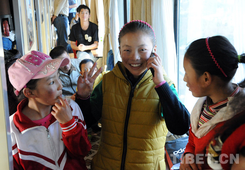 這是乘火車進京治療先心病的患兒卓嘎,在火車將抵達北京時,給阿爸打電話報平安(唐召明2012年9月18日攝)