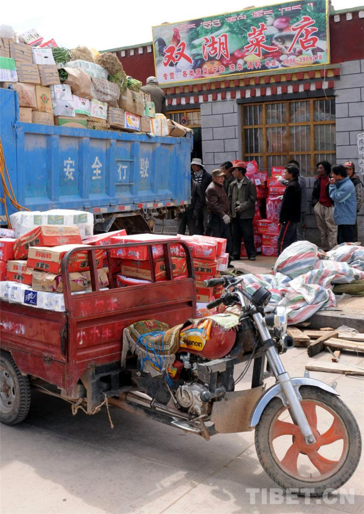 這是雙湖特別區(qū)(現(xiàn)為雙湖縣)的“雙湖菜店”正在準(zhǔn)備把包車運(yùn)來的蔬菜等物品卸貨(唐召明2009年8月攝)