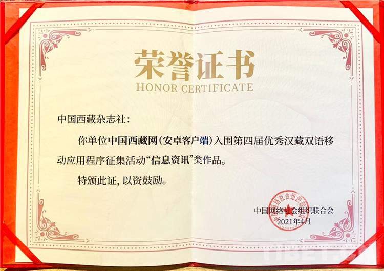 圖為中國西藏網(wǎng)的獲獎榮譽(yù)證書