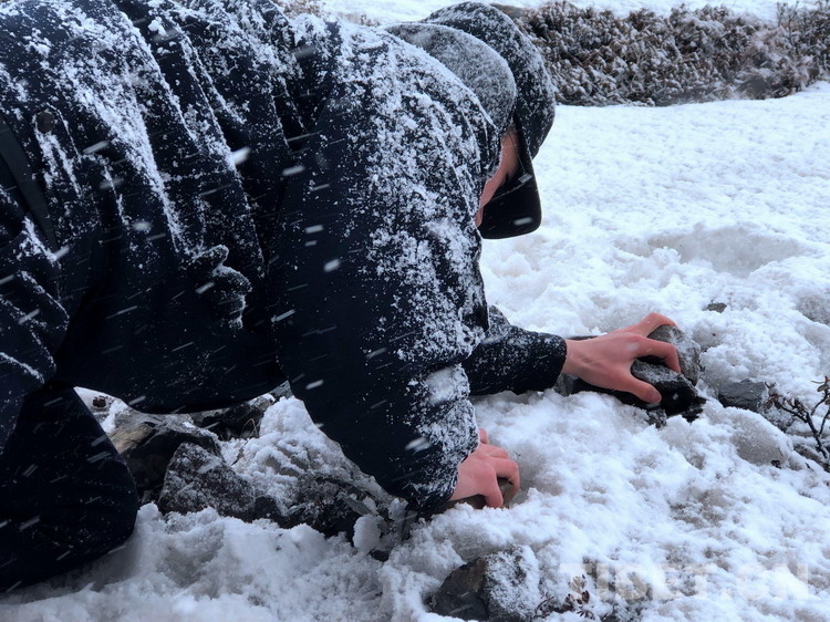 西藏日喀則邊境管理支隊貢當(dāng)邊境派出所拉青拉的執(zhí)勤民警開始一天的巡邏工作。巡邏點位要穿越較厚的積雪區(qū),攀爬被冰雪覆蓋的陡坡,一路危險重重,為了不增加負擔(dān),除了必要的警用裝備,大家都是最大限度的輕裝簡行,連干糧和水都是定量攜帶、定時食用。巡邏車碾冰軋雪,在茫茫雪海留下一道清晰的車轍,一路荒無人煙,積雪越來越厚。在距離界樁不到兩百米的地方,巡邏車被數(shù)十厘米厚的積雪攔住去路,大家只好下車徒步前進,由于風(fēng)大路險,民警們只能彎著腰手腳并用匍匐著前行,隊伍里只能聽到沉重的喘息聲和腳踏積雪咯吱聲。一百多米的路走了二十分鐘,最終到達界樁,大家來不及休整,立刻展開觀察、警戒、檢跡記錄。積雪覆蓋的界樁旁,巡邏民警整齊列隊,面向國旗,緊握右拳,朝著國旗莊嚴敬禮:“邊境有我,請祖國放心!”